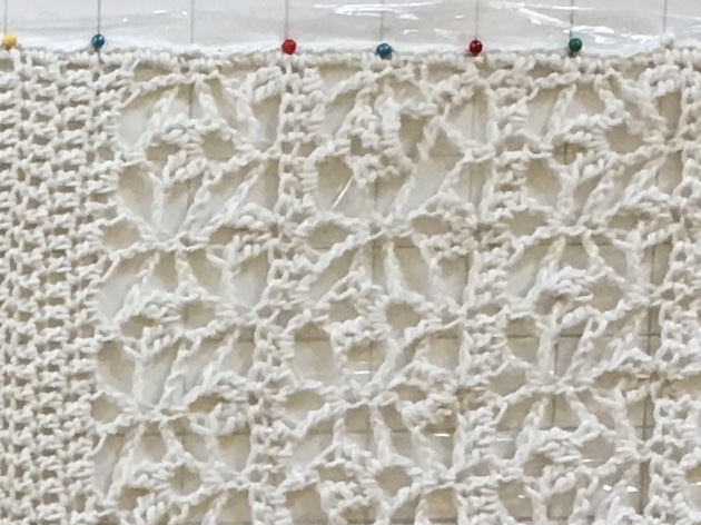 When I block something with these boards, I always cover them with plastic wrap.  This is to keep the board dry as I stretch out the wet fabric or spray it with water.  Sometimes I dunk a piece in a bowl of water (at times I add a drop of detergent).  For my vest, I stretched it out first, pinning it tight, and using the graph so the lace is taut and even.