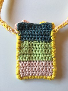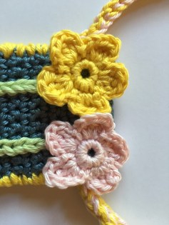 With yellow yarn and needle, wrap front and back edges together to make a cord-like edging. Top of the back should be 3 sc above the front top edge.