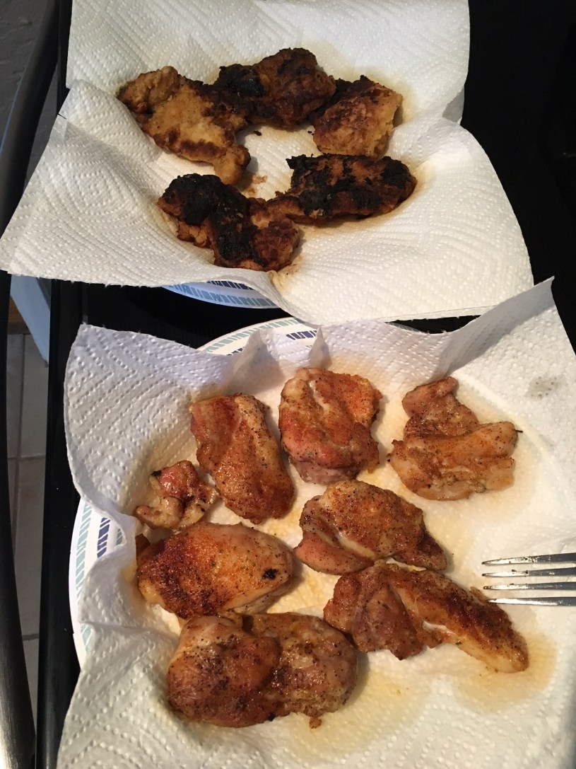 I did not go back and continue to fry up the Double Dipped Fried Chicken. I loaded all the ones I dipped, seasoned those yet to be dipped and placed them into the baking pan. It only took about 45 minutes for the chicken to cook, and they turned out juicy (and a little burnt). We all agreed, though, that the plain seasoned chicken turned out the best. I think I’ll stick to that next time.